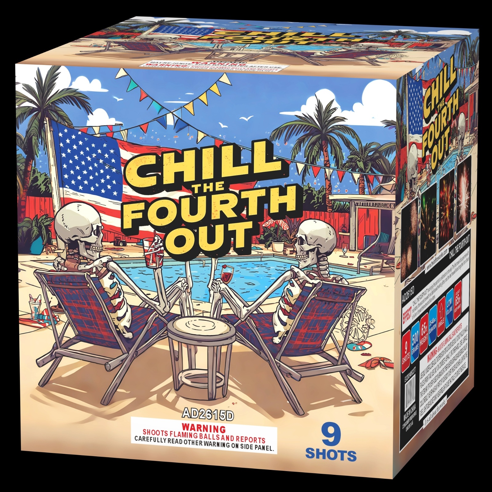 CHILL THE FOURTH OUT!: The 1st row is blue peonies with red stars; 2nd row is red dahlias with white glitter; Last row will shoot together with a finale of silver chrysanthemums and blue stars.