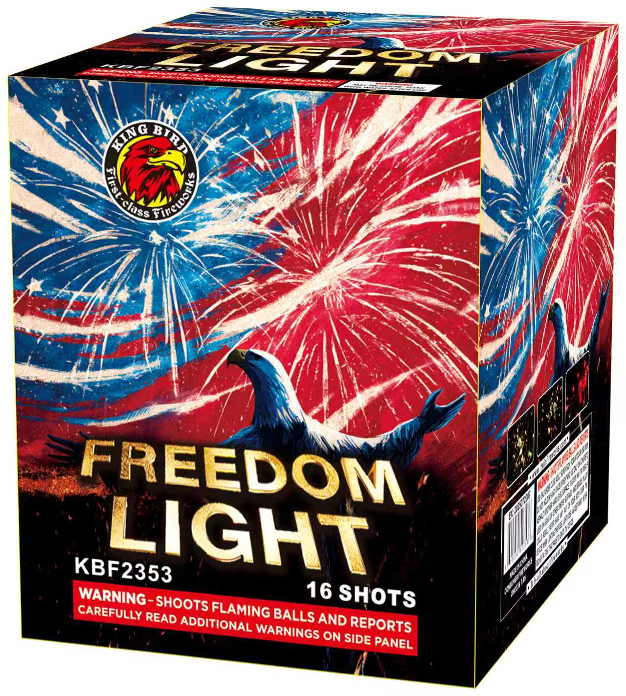 Let the FREEDOM LIGHT shine with this 200G cake! Red and blue crackling with red tail;white and blueglitter with blue tail; red and blue crackling with blue tail; gold coconut with white glitter with gold tail.