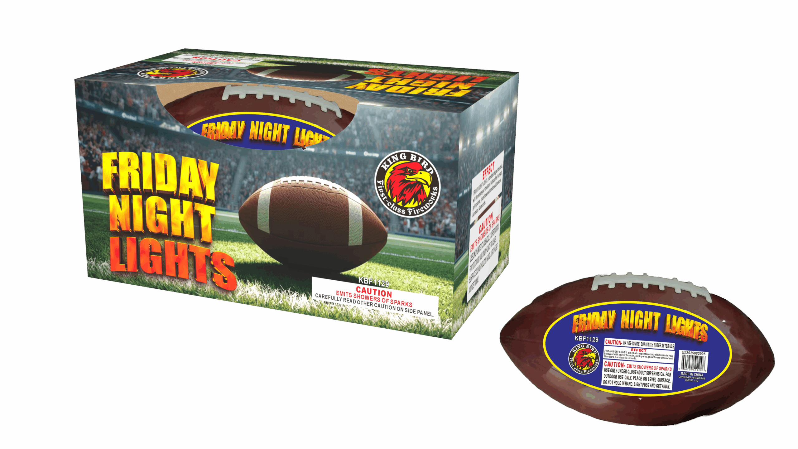 FRIDAY NIGHT LIGHTS, a football shaped fountain, will illuminate your backyard with silver fountain, gold sparks, ghost flower with red and blue stars. Duration: 50 seconds