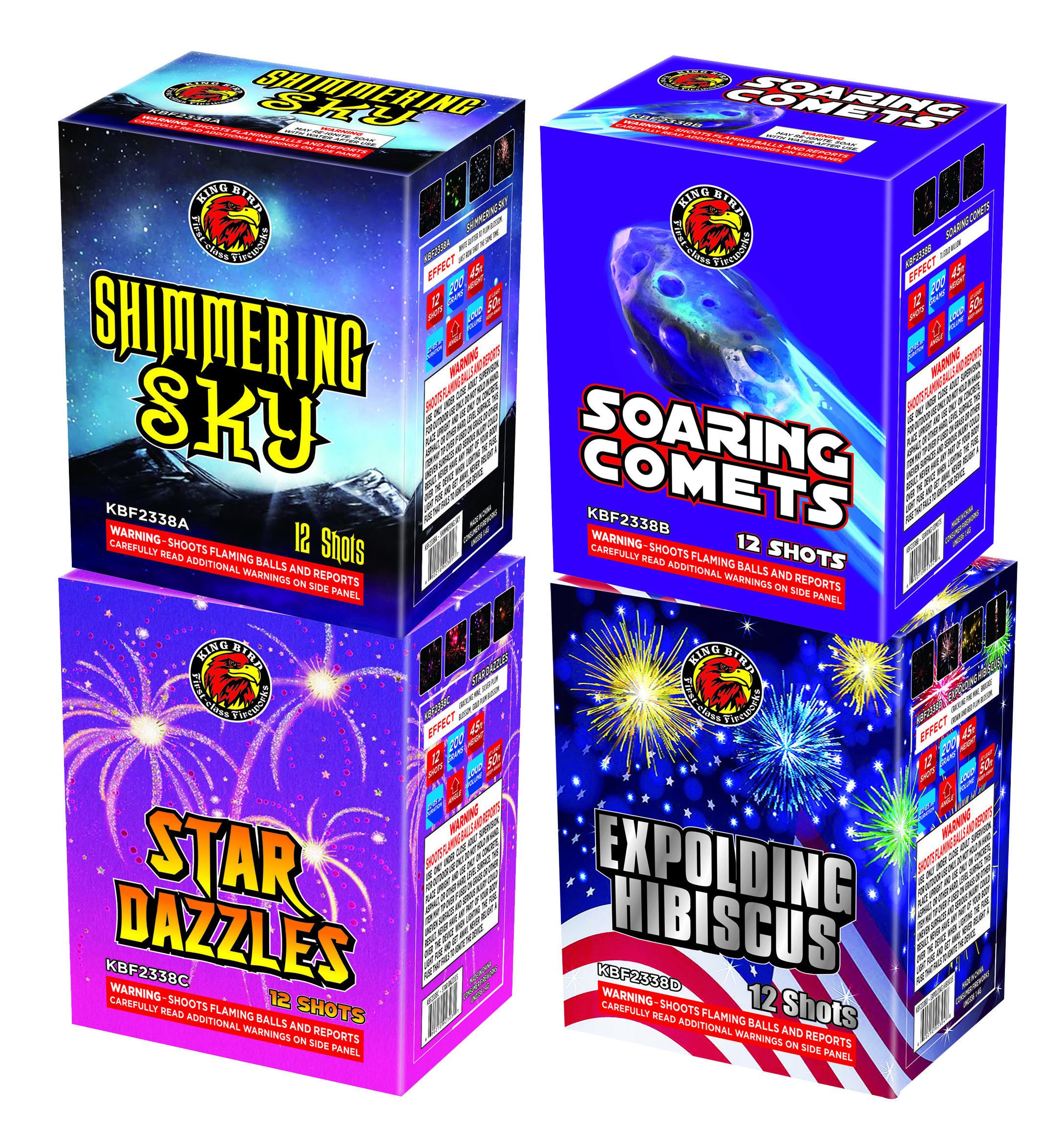 A 200 Gram Cakes assortment of 4 cakes with 12 shots each. White glitter to plum blossom. Last row fires together for big finish!