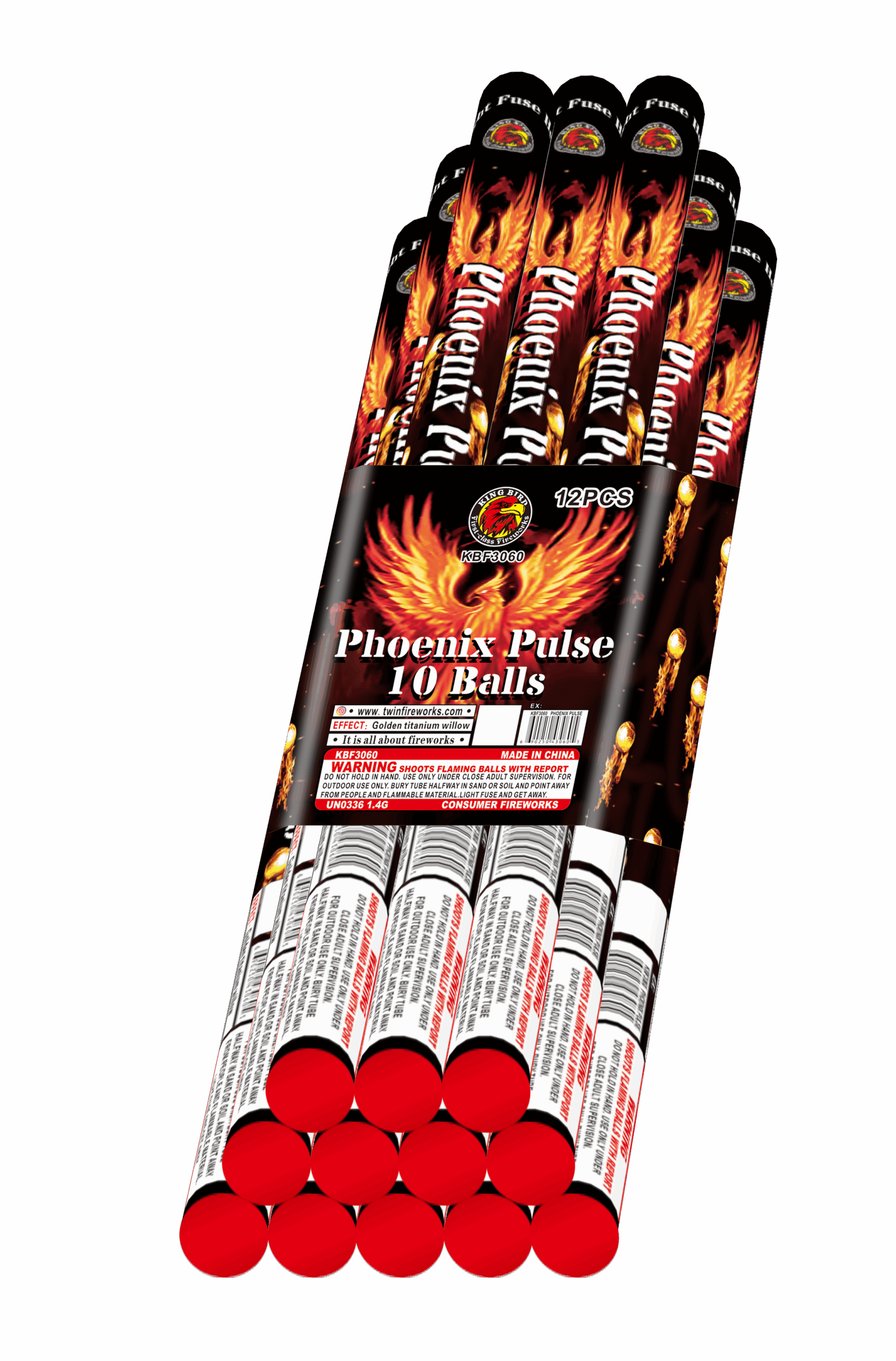 Feel the PHOENIX PULSE with 10 balls of golden willow. This is a 12 pack of roman candles.