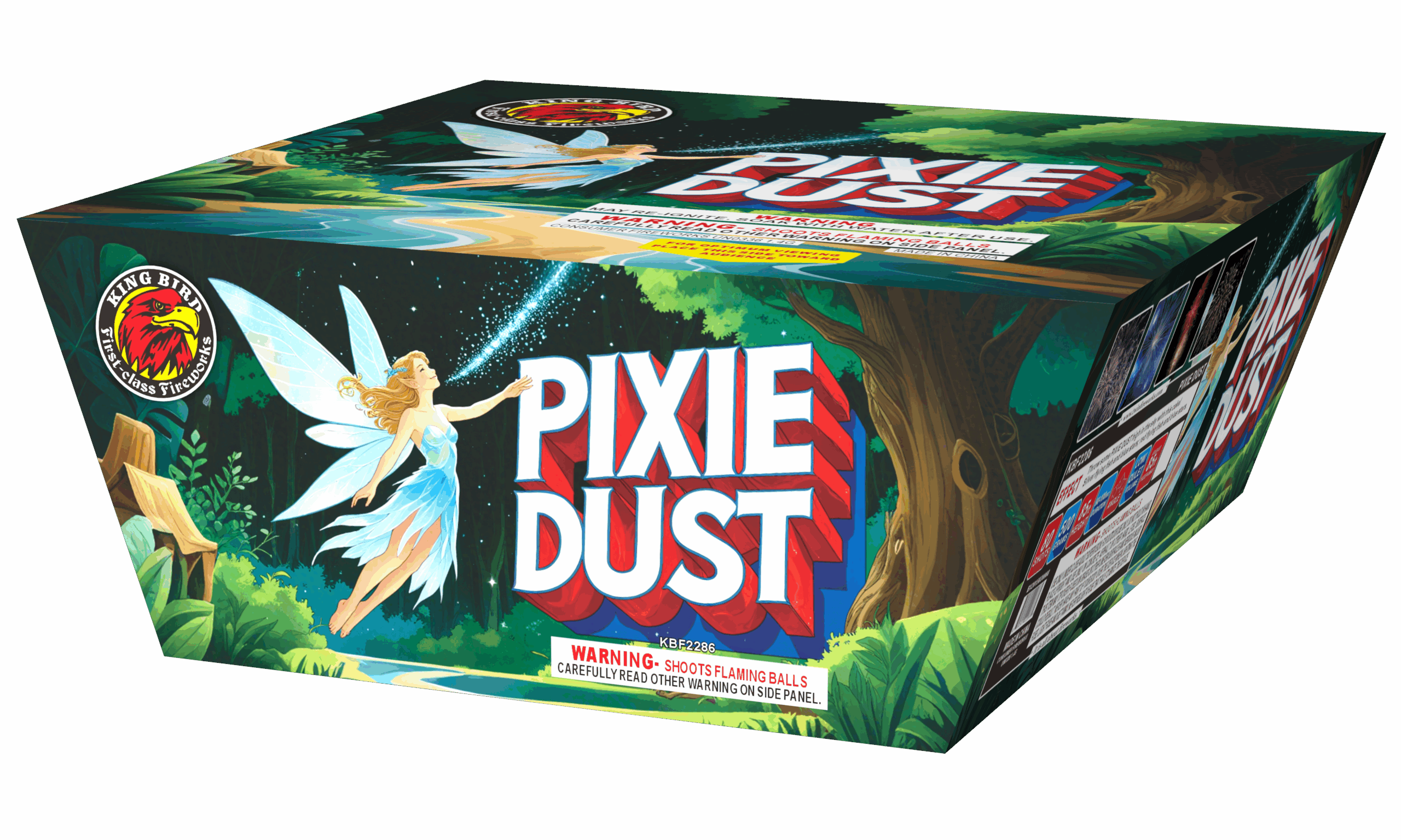 Throw some PIXIE DUST high in the sky with this cake! This 80 shot cake with silver flying fish and blue stars; red flying fish and blue stars.