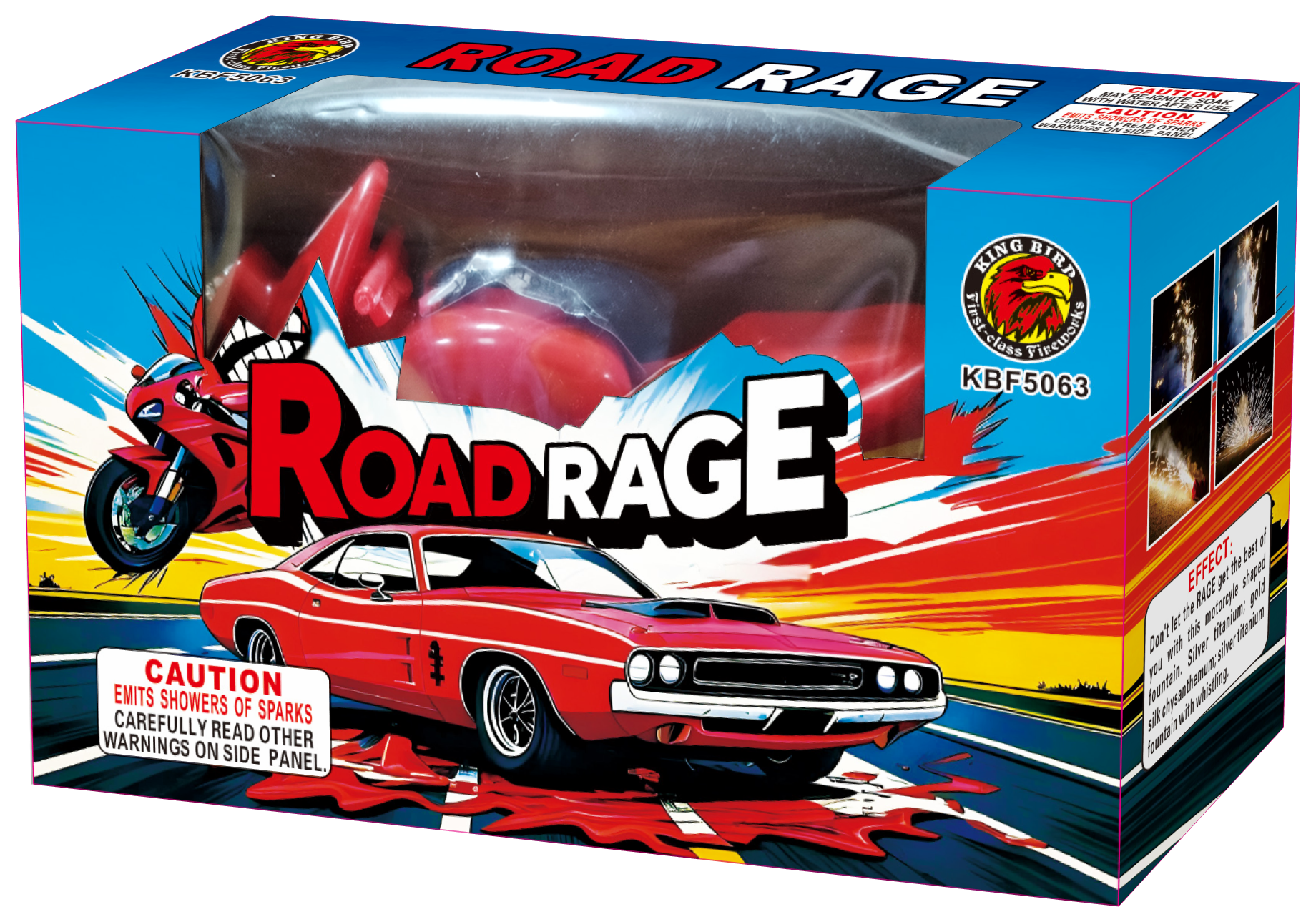 Don’t let the RAGE get the best of you with this motorcycle shaped fountain. Silver titanium; gold silk chrysanthemum; silver titanium fountain with whistling.