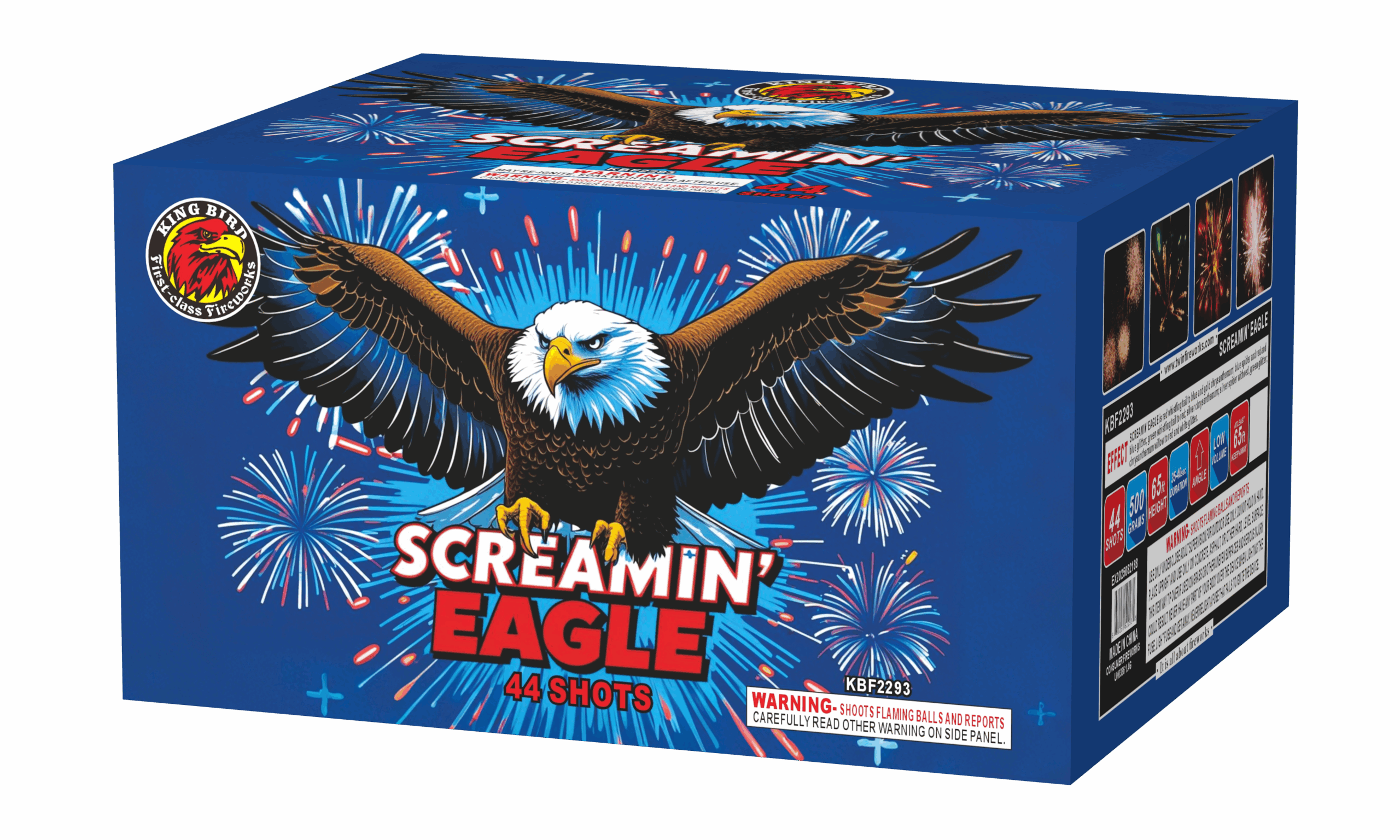 SCREAMIN’ EAGLE is red whistling tail to blue and gold chrysanthemum; blue spider and red and blue glitter; green whistling tail to red; silver chrysanthemum; silver spider with red, green glitter; chrysanthemum willow to red and white glitter.